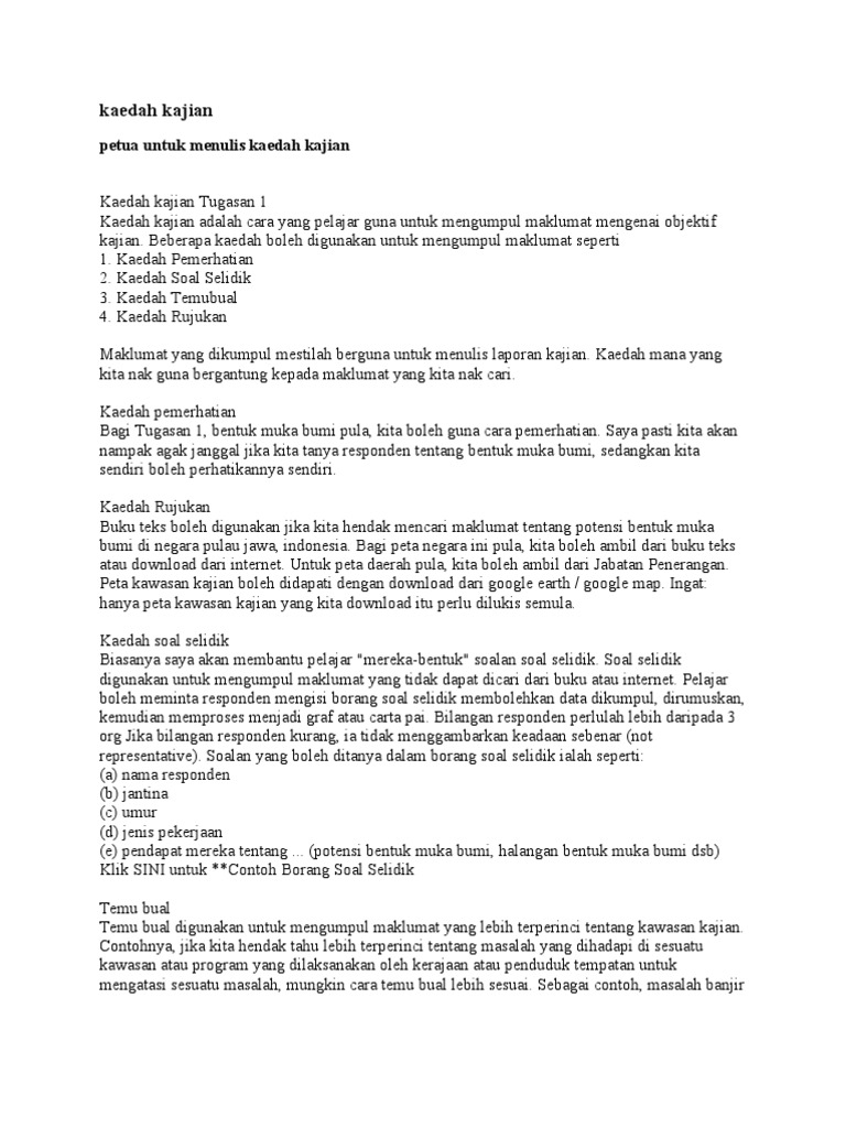 . PANDUAN MENULIS LAPORAN KAJIAN. Dan lokasi instrumen kajian kaedah pengumpulan data dan lain-lain yang berkaitan. Kaedah temu bual merupakan kaedah yang pertama saya gunakan.